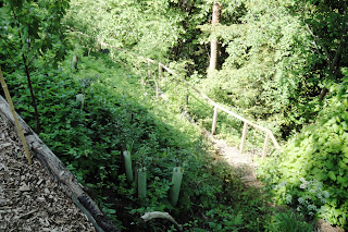 Steps have been constructed into the slope of the woodland bank for safe access to the area below the path broadening where the soil erosion is at its worst and where further planting is planned once the water management issue is resolved. The hand rail is due to be replaced with more attractive wood poles instead of straight cut timbers. More steps are required to complete these works and are indicated on the plan.